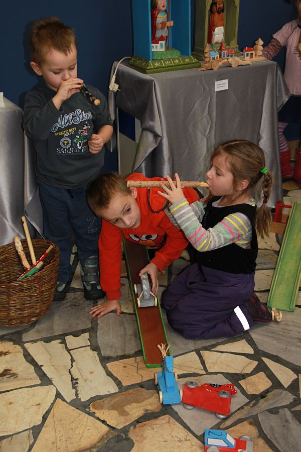 23 stycznia w Centrum Informacji Turystycznej w Nowym Sączu zagościły dzieci z przedszkoli „Promyczek” i „Tęcza” oraz rodzice z dziećmi. Dzieci miały możliwość pobawienia się drewnianymi samochodzikami, konikami, cymbałkami, dinozaurami, grzechotkami, bączkami. Zabawki zaskoczyły dzieci swoim wykonaniem i prostotą. Do świata drewnianych zabawek wprowadzał ich sam mistrz i czarownik dłuta Marian Mółka. W czasie spotkania powstały kolorowe prace dzieci, nawiązujące do prac pana Mółki.
