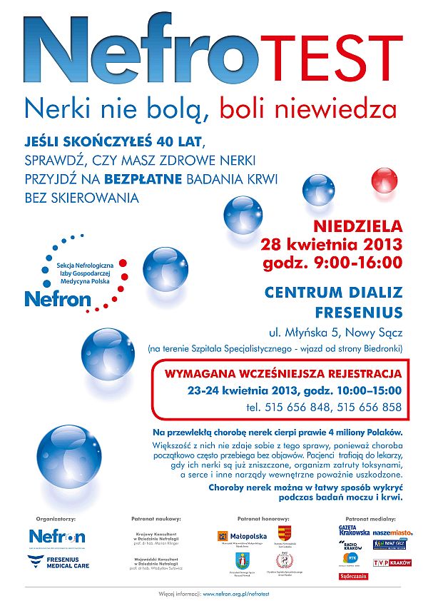 Już 28 kwietnia (niedziela) 2013 roku, w Nowym Sączu będzie można wykonać bezpłatne, proste badania krwi pod kątem chorób nerek. By wziąć udział w akcji trzeba mieć ukończone 40 lat i wcześniej się zarejestrować. Ilość miejsc na badania jest ograniczona i wynosi 400. Akcja w Nowym Sączu jest częścią ogólnopolskiej kampanii NEFROTEST, organizowanej przez Nefron Sekcję Nefrologiczną Izby Gospodarczej Medycyna Polska oraz Centrum Dializ Fresenius w Nowym Sączu. Wsparcia dla akcji na terenie całego kraju udzieliła Pani Anna Komorowska – Małżonka Prezydenta RP. Na szczeblu regionalnym badania swoim patronatem wspierają: Jerzy Miller – Wojewoda Małopolski, Marek Sowa – Marszałek Województwa Małopolskiego, Andrzej Jeż – Biskup Tarnowski, Ryszard Nowak – Prezydent Nowego Sącza, Jan Golonka – Starosta Powiatu Nowosądeckiego oraz lek. med. Artur Puszko – Dyrektor Szpitala Specjalistycznego w Nowym Sączu.