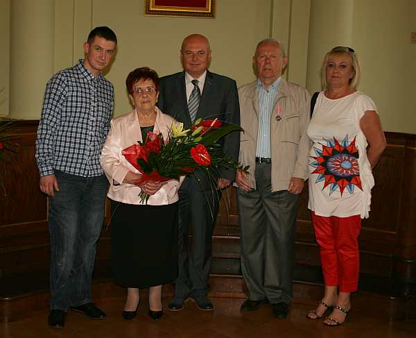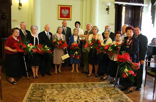 „Pięćdziesiąt lat to wiele, a przeżycia w ciągu tych długich lat – radości i smutki związały Państwa jeszcze bardziej. Przez te wszystkie lata troszczyli się Państwo o zapewnienie bytu rodzinie, o dobre wychowanie dzieci i ich przyszyły los. A dzisiaj dzieci, wnuki i prawnuki są Wam wdzięczni za trud i poświęcenie oraz darzą Was wielkim szacunkiem. Medale te są podziękowaniem za wszystko, co tak długo Państwo budowaliście jako małżeństwo i rodzina. Swój związek zbudowaliście na miłości, wierności i uczciwości małżeńskiej, co pozwoliło Wam wytrwać razem tyle lat i teraz świętować z nami swój Jubileusz” – powiedziała zastępca kierownika USC Monika Lichoń. Prezydent Ryszard Nowak składając Jubilatom życzenia podkreślił, że poprzez wspaniały wzór dobrego, małżeńskiego życia i wychowanie dzieci, są dumą naszego miasta. „Życzę zdrowia, radości, jak najwięcej wspaniałych chwil, których na pewno nie brakowało w Państwa małżeństwie, miłości ze strony najbliższych i przyjaciół. Wszystkiego najlepszego” – dodał prezydent. Następnie Jubilaci otrzymali krzyże za długoletnie pożycie małżeńskie przyznane przez Prezydenta RP.