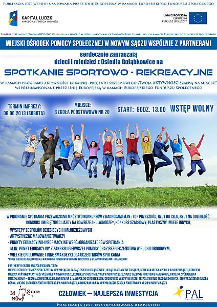 Realizując projekt systemowy „Twoja AKTYWNOŚĆ szansą na sukces!”, współfinansowany ze środków Unii Europejskiej w ramach Europejskiego Funduszu Społecznego, Miejski Ośrodek Pomocy Społecznej w Nowym Sączu jako Lider, w roku 2013 obejmuje działaniami teren osiedla Gołąbkowice. W związku z tym, wraz z lokalnymi Partnerami zaprasza na: