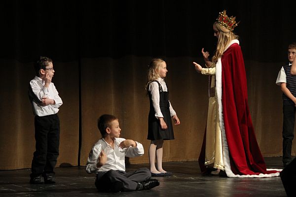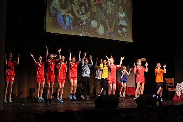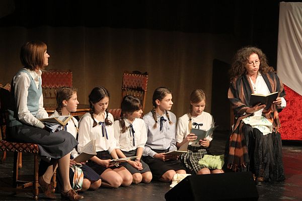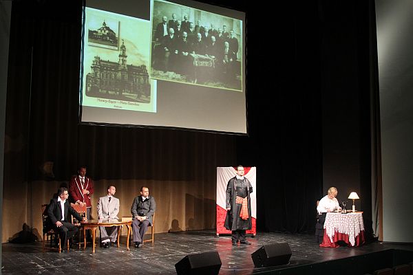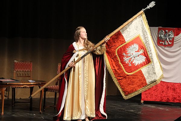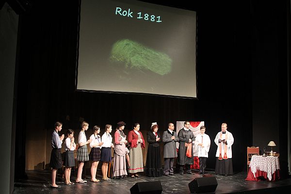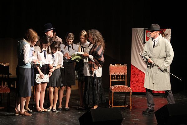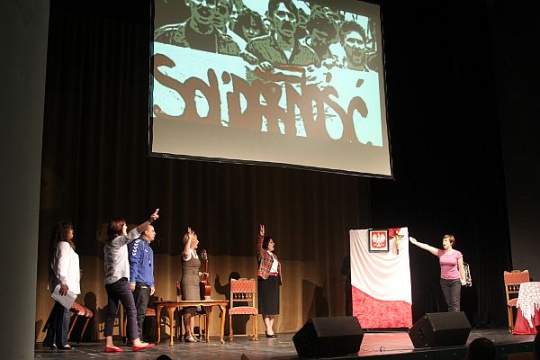 Społeczność szkoły i zaproszeni goście obejrzeli widowisko przygotowane przez nauczycieli i uczniów placówki, w którym odegrano scenki historyczne dotyczące najważniejszych wydarzeń z życia szkoły, miasta i kraju.