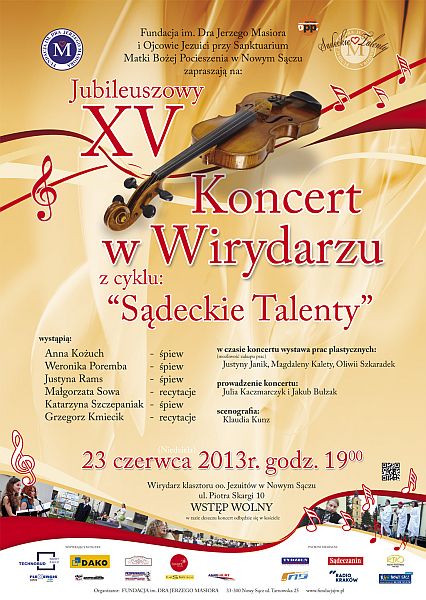 XV Koncert w Wirydarzu odbędzie się 23 czerwca (niedziela) 2013 r. o godz. 19.00 w wirydarza klasztoru oo. jezuitów przy ul. Piotra Skargi 10 w Nowym Sączu.