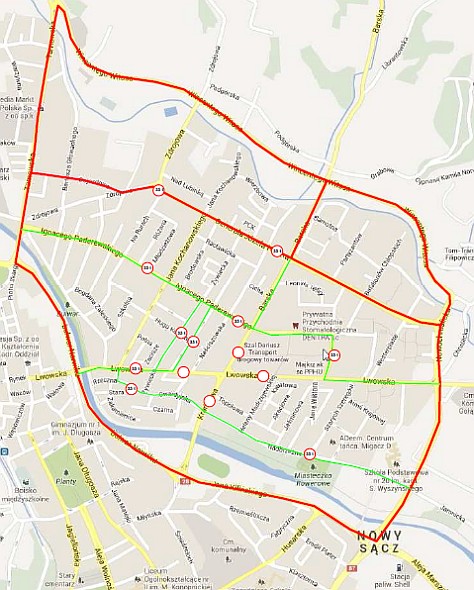ul. Prażmowskiego, ul. Kilińskiego, ul. Bulwar Narwiku, ul. Kazimierza Wielkiego lub ulicą Sucharskiego, ul. Hallera, ul. Zdrojowa, ul. Tarnowska, ul. Kazimierza Wielkiego