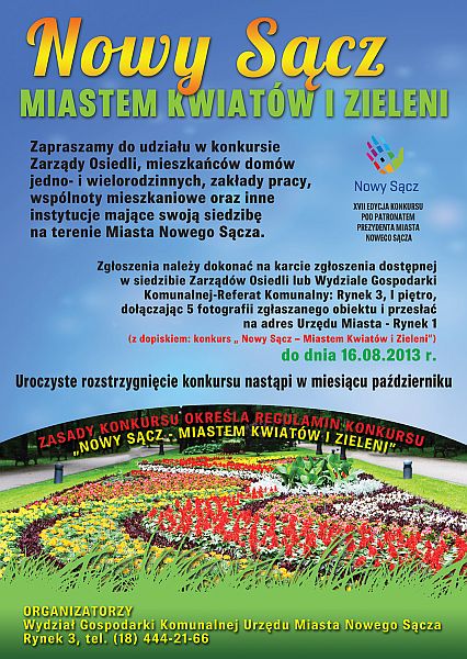 Tradycyjnie, jak co roku, rusza kolejna - XVI edycja konkursu "Nowy Sącz Miastem Kwiatów i Zieleni", który odbywa się pod patronatem Prezydenta Miasta Nowego Sącza Ryszarda Nowaka. Jest to propozycja skierowana do wszystkich mieszkańców domów jedno- i wielorodzinnych,zarządów osiedli, szkół, zakładów pracy oraz innych instytucji, mających swoją siedzibę na terenie miasta Nowego Sącza.