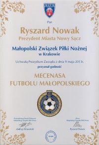 Zawodnikom gratulował prezydent Ryszard Nowak. „Jesteśmy zaszczyceni, że władze piłkarskie Małopolskiego Związku Piłki Nożnej na czele z prezesem Ryszardem Niemcem, powierzyły sądeckiemu Związkowi organizację Turnieju Finałowego o Puchar im. Jerzego Michałowicza rangi Mistrzostw Polski U-15. Dziękuję za obecność. Wszyscy jesteście zwycięzcami” – podkreślił prezydent, który podczas sobotniej uroczystości sam został wyróżniony. Małopolski Związek Piłki Nożnej w Krakowie przyznał prezydentowi godność Mecenasa Futbolu Małopolskiego. Pamiątkowy dyplom przekazali Ryszard Niemiec, prezes Małopolskiego Związki Piłki Nożnej w Krakowie oraz Antoni Ogórek, prezes Okręgowego Związku Piłki Nożnej w Nowym Sączu.