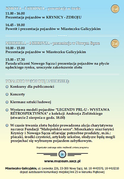 W programie imprezy przewidziana jest prezentacja w trasie – w Krynicy-Zdroju, prezentacja zabytkowych pojazdów w Miasteczku Galicyjskim, parada ulicami Nowego Sącza, prezentacja pojazdów na płycie sądeckiego Rynku oraz konkursy dla publiczności, koncerty czy kiermasz sztuki ludowej.