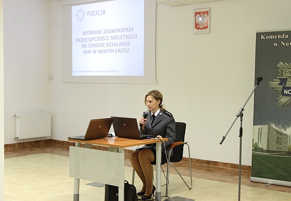 „Wybrane zagadnienia przestępczości nieletnich na terenie działania KMP w Nowym Sączu”, który zreferowała nadkom. mgr Iwona Janik-Hejmej z Wydziału Prewencji Komendy Miejskiej Policji w Nowym Sączu,