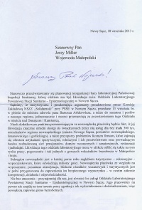 List podpisali przedstawiciele samorządów uczestniczących 18 września 2013 r. w spotkaniu w Nowym Sączu nt. projektu Kontraktu Terytorialnego dla Małopolski oraz radni wojewódzcy Marta Mordarska, Grzegorz Biedroń i Paweł Śliwa. Samorządowcy wyrazili nadzieję, że będą potraktowani po partnersku i oczekują, że w przypadku ważnych dla regionu spraw będą uczestniczyć w konsultacjach, a przyjęte rozwiązania służyć będą obywatelom i gościom naszego subregionu. „Nie tylko spojrzenie na nasze regiony z perspektywy Wzgórza Wawelskiego powinno decydować o podejmowanych decyzjach. Jeśli postanowi Pan zlikwidować nowosądecką placówkę - Oddział Laboratoryjny Powiatowej Stacji Sanitarno–Epidemiologicznej w Nowym Sączu, potwierdzi Pan po raz kolejny przykry i bolesny fakt degradacji roli i rangi Nowego Sącza, spychania miasta na margines województwa, już nie do drugiej, ale trzeciej ligi. Z obietnic specjalnego traktowania byłych miast wojewódzkich pozostaną puste słowa” - zakończył list wiceprezydent Jerzy Gwiżdż.