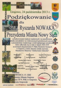 Reprezentacja JS 2006 Nowy Sącz Związku Strzeleckiego „STRZELEC” OSW wraz z opiekunami Sławomirem Szczerkowskim i Barbarą Fydą podziękowała prezydentowi Ryszardowi Nowakowi za pomoc w zorganizowaniu wyjazdu na IV MUNDUROWE MANEWRY „Zdobywanie Jednostki” w Grajewie. Strzelcy przekazali również pamiątki i podziękowania od organizatorów imprezy - „za kultywowanie tradycji wojskowych i za umożliwienie udziału zawodników we wskrzeszonych prestiżowych zawodach z przeszkolenia wojskowego o tytuł najlepszego szwadronu, które odbywały się co roku w latach 1924-1939 na terenach stacjonowania 9. Pułku Strzelców Konnych w Grajewie, a które obecnie zostały nazwane Mundurowe Manewry „Zdobywanie Jednostki” – czytamy na pamiątkowym dyplomie.