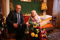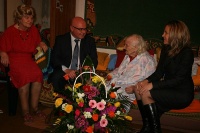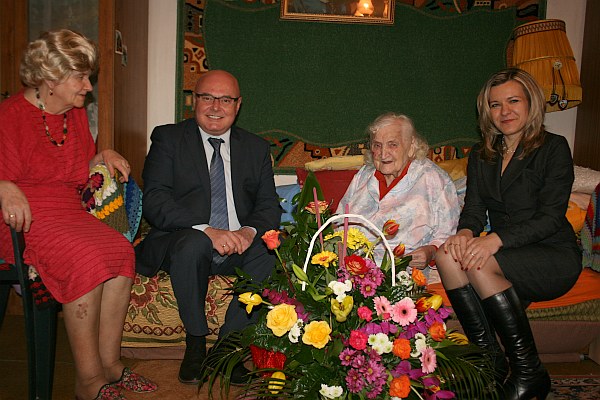 Prezydent Ryszard Nowak złożył urodzinowe życzenia pani Helenie Kucharskiej. Pani Helena obchodzi setne urodziny. Prezydent życzył Jubilatce zdrowia i miłości ze strony najbliższych. Przekazał list gratulacyjny i upominek. Życzenia złożyła również kierownik USC Małgorzata Antkiewicz-Wójs.