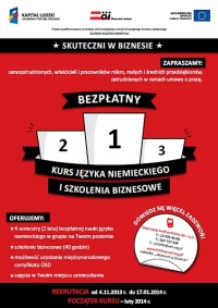Z uwagi na fakt, iż projekt ,,Skuteczni w biznesie” skierowany jest do pracowników i właścicieli firm, organizatorzy zadbali również o rozwój kompetencji biznesowych uczestników. Program szkoleniowy to maksimum praktyki oraz rozsądna dawka teorii. Wśród omawianych tematów znajdą się negocjacje, asertywność, coaching, zarządzanie sobą w czasie oraz metody skutecznej autoprezentacji.