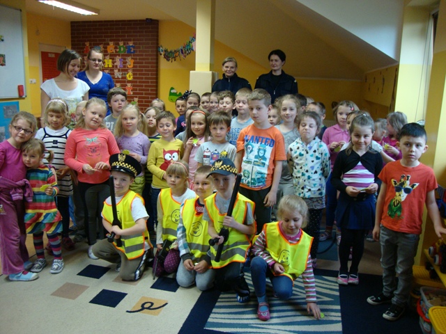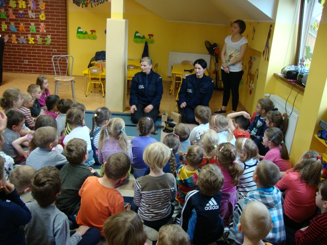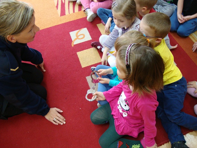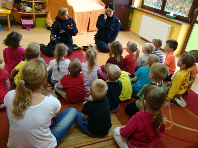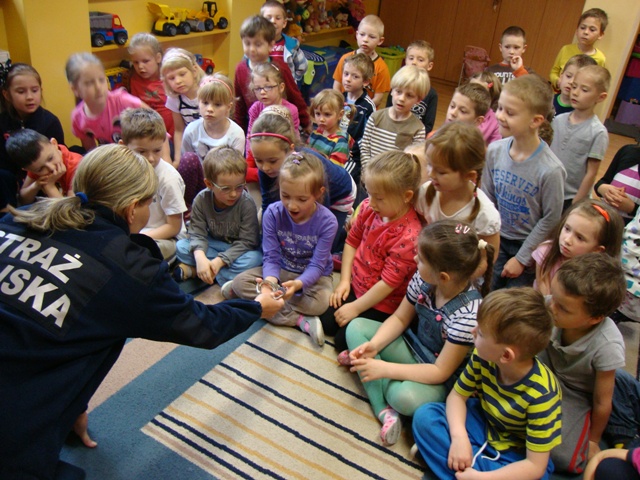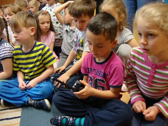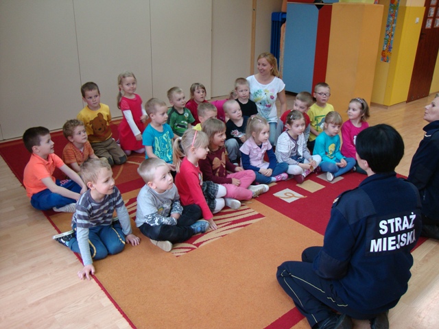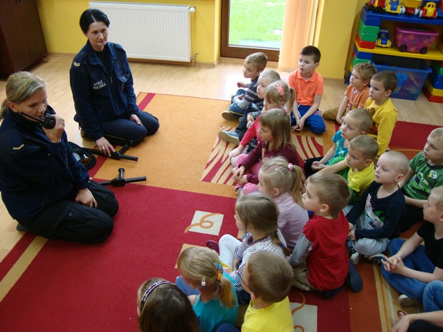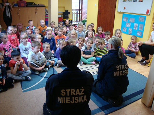 Maluchy zadawały pytania dotyczące pracy strażniczej i sprzętu, który jest na stanie komendy. Funkcjonariuszki pokazały dzieciom kilka rodzajów umundurowania strażnika miejskiego i wyjaśniły dlaczego zawsze przy sobie noszą pałkę, kajdanki i gaz. Największą frajdą dla naszych słuchaczy okazała się jednak możliwość rozmowy poprzez radiostację z dyżurnym Komendy Straży Miejskiej i strażnikami patrolującymi miasto – Dzień dobry! Miłego dnia w pracy – usłyszeli wszyscy mundurowi dzięki swoim odbiornikom.