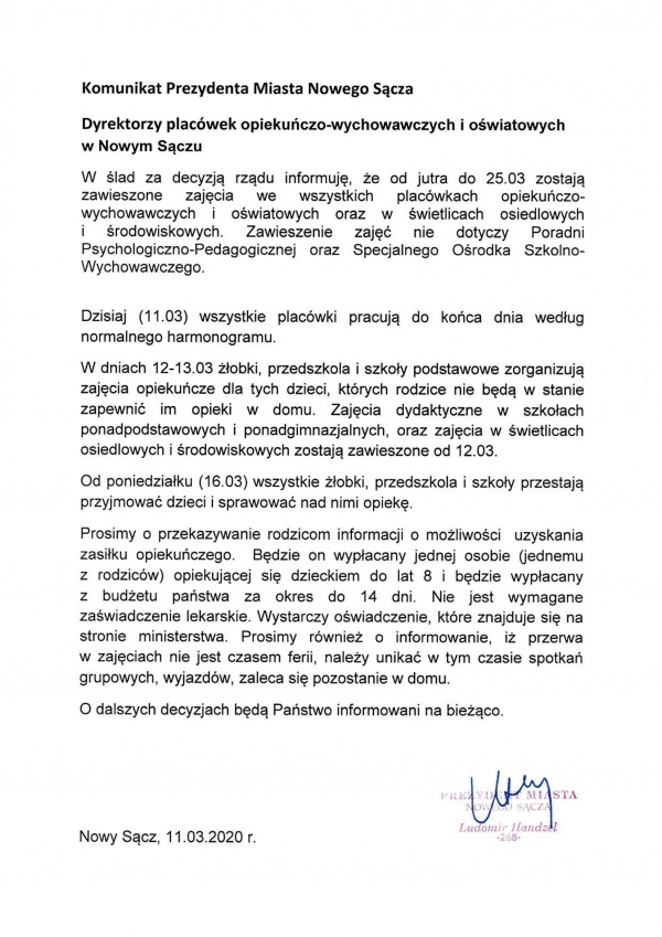W sali reprezentacyjnej Ratusza odbyła się konferencja prasowa dotycząca zawieszenia zajęć we wszystkich placówkach opiekuńczo-wychowawczych i oświatowych oraz w świetlicach osiedlowych i środowiskowych. W trakcie konferencji zastępca prezydenta Magdalena Majka oraz sekretarz Piotr Lachowicz przekazali mediom komunikat prezydenta Ludomira Handzla.