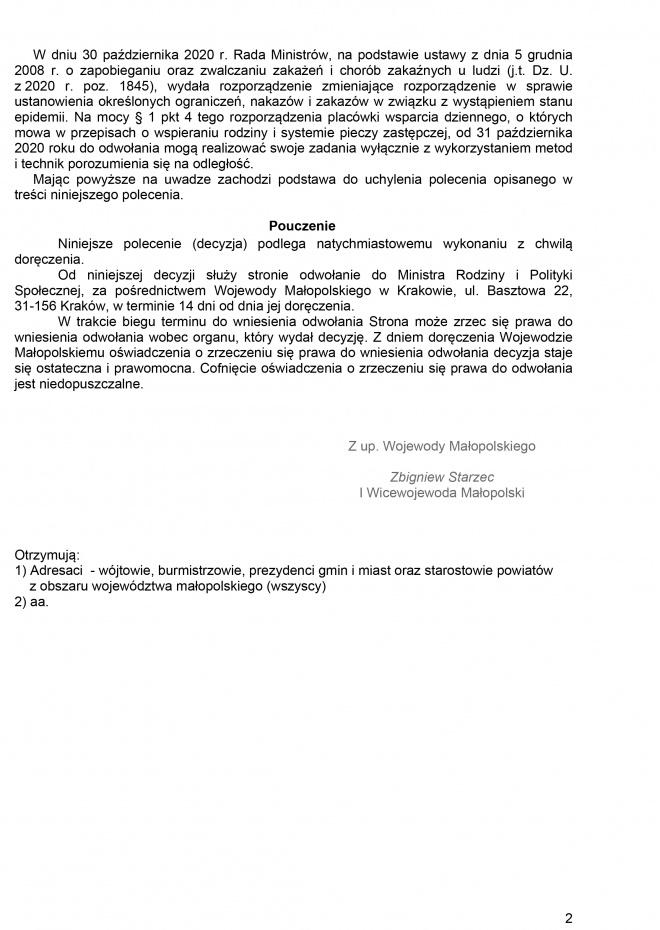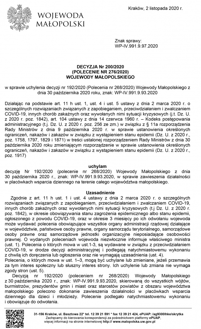 Wojewoda Małopolski wydał Decyzję nr 200/2020 (Polecenie nr 276/2020) w sprawie uchylenia decyzji nr 192/2020 (Polecenie nr 268/2020) Wojewody Małopolskiego z dnia 30 października 2020 roku, znak:WP-IV.991.9.93.2020 skierowaną do wszystkich wójtów, burmistrzów, prezydentów gmin i miast oraz starostów powiatów z obszaru województwa małopolskiego, w której polecono dokonanie zawieszenia działalności w placówkach wsparcia dziennego dla dzieci i młodzieży. Polecenie podlegało natychmiastowemu wykonaniu i obowiązywało do odwołania.