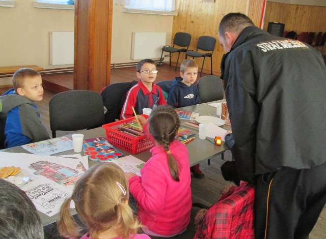 Strażacy pokazują sprzęt będący na wyposażeniu komendy, uczą dzieci udzielania pierwszej pomocy, wyświetlają bajki, a nawet pomagają w rysowaniu wozów strażackich.