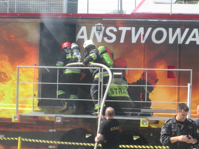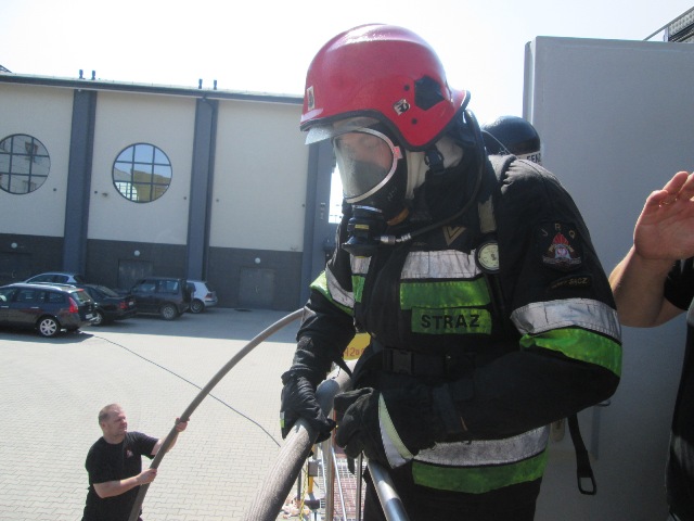 Po prelekcji, strażnicy miejscy uczestniczyli w zajęciach praktycznych. Ubrani zostali w specjalistyczną odzież, która chroni życie strażaków w czasie akcji ratowniczych. Funkcjonariusze Straży Miejskiej na własnej skórze poczuli w jakich warunkach przychodzi strażakom walczyć z ogniem i dymem, a także ciężar sprzętu, którym należy ugasić ogień.