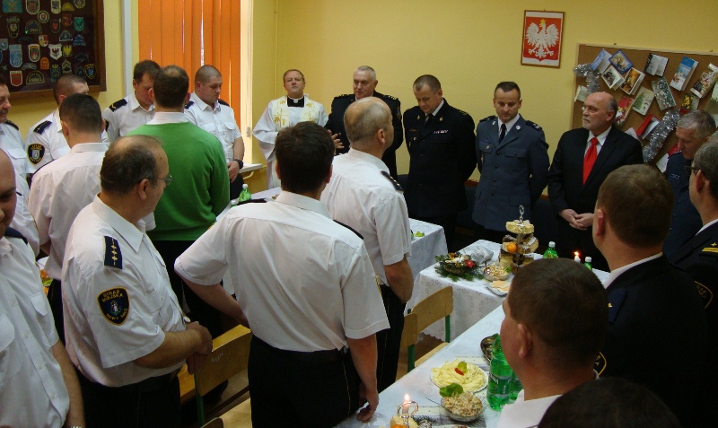 Wspaniałą atmosferę zapewniły strażniczki komendy, które samodzielnie przygotowały pyszny barszcz, kapustę z grochem i różnego rodzaju sałatki. Była też zimna płyta i ciasto. Udekorowana sala odpraw i przykryte białymi obrusami stoły sprawiły, że pracownicy komendy poczuli się wyjątkowo świątecznie. – Pragnę złożyć wszystkim z serca płynące życzenia. Myślę, że najlepsze będą tu słowa kolędy „Podnieś rękę Boże Dziecię, błogosław ojczyznę miłą". Życzę tego zarówno sobie jak i Państwu – powiedział Komendant Adam Kaufman. Prezydent Jerzy Gwiżdż przyznał, iż chciałby, żeby cały Urząd Miast był niczym jedna wielka rodzina. – Pragnę żeby wszyscy byli dla siebie pomocni, życzliwi i sprawiedliwi. Powinniśmy patrzeć na siebie po przyjacielsku. – Powiedział Jerzy Gwiżdż i dodał: - Przyjemnych Świąt. Oby nic się złego nie wydarzyło.