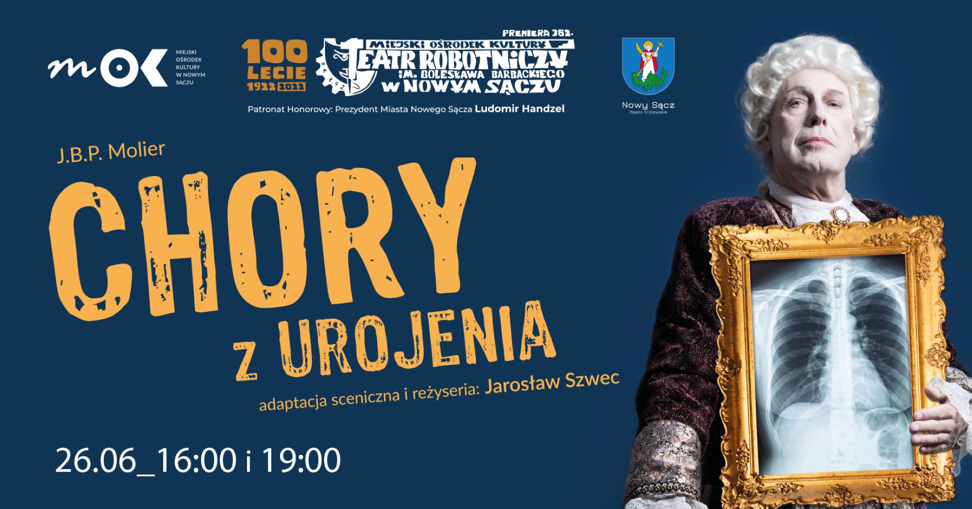 Zapraszamy na spektakl "CHORY Z UROJENIA" w wykonaniu Teatru Robotniczego im. B. Barbackiego w Nowym Sączu, w reżyserii Jarosława Szweca. Spektakl odbędzie się w niedzielę 26 czerwca o godz. 16:00 i 19:00.