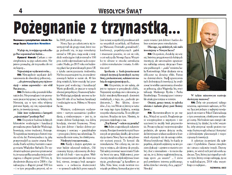 A zakończę życzeniami dla sądeczan i Czytelników. Zawsze cieszyłem się i cieszę z sukcesów innych. Dumny jestem, że wśród nich jest tak wielu sądeczan. Tym, którzy już sięgnęli po sukces i tym, którzy o niego zabiegają, życzę w nadchodzącym, 2014 roku wszystkiego co najlepsze…