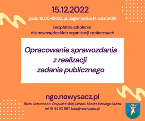 Biuro Aktywności Obywatelskiej zaprasza przedstawicielki i przedstawicieli nowosądeckich organizacji społecznych do udziału w bezpłatnym szkoleniu Opracowanie sprawozdania z realizacji zadania publicznego.