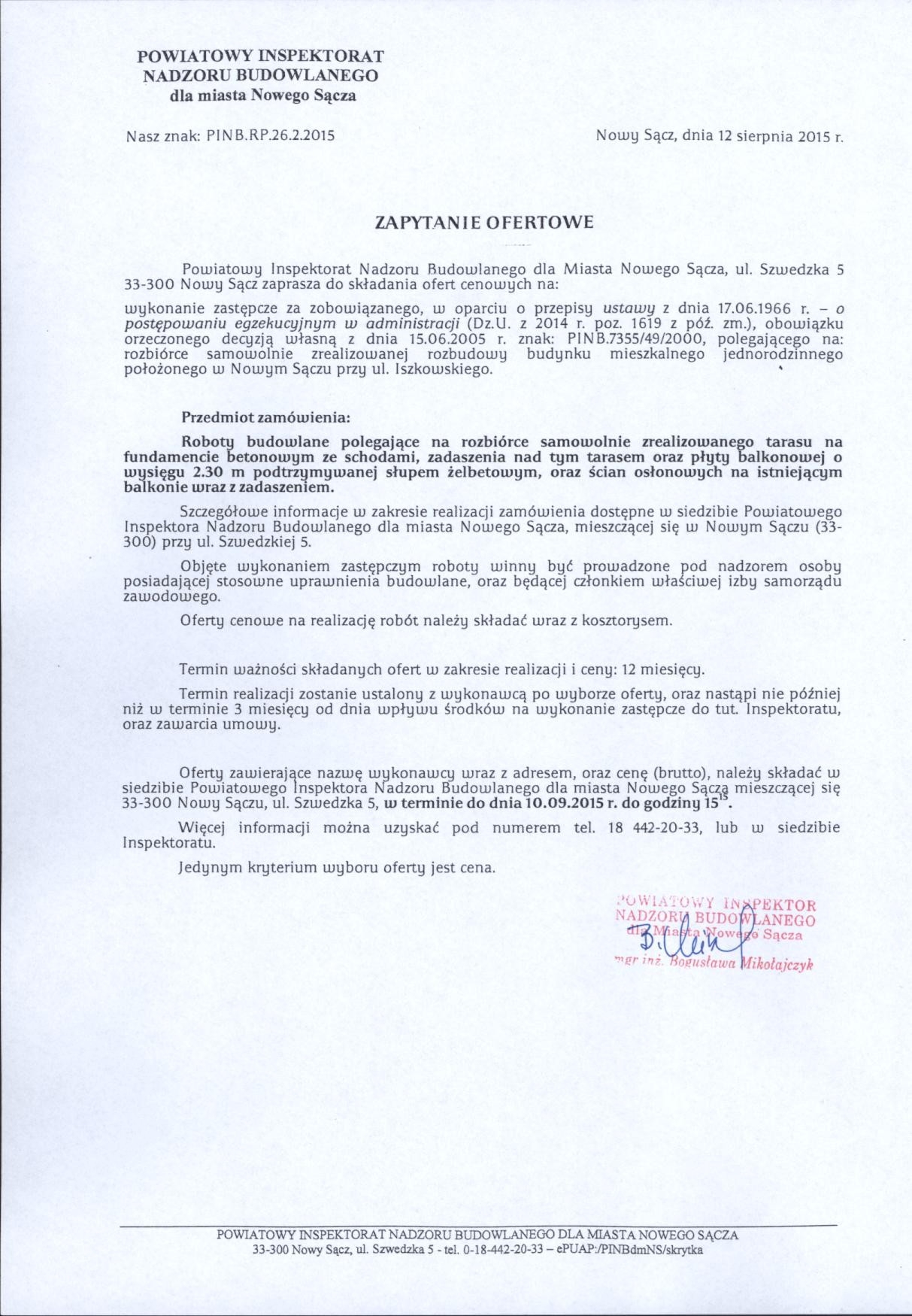Oferty zawierające nazwę wykonawcy wraz z adresem, oraz cenę (brutto), należy składać w siedzibie Powiatowego Inspektora Nadzoru Budowlanego dla miasta Nowego Sącza mieszczącej się 33-300 Nowy Sączu, ul. Szwedzka 5, w terminie do dnia 10.09.2015 r. do godziny 1515.