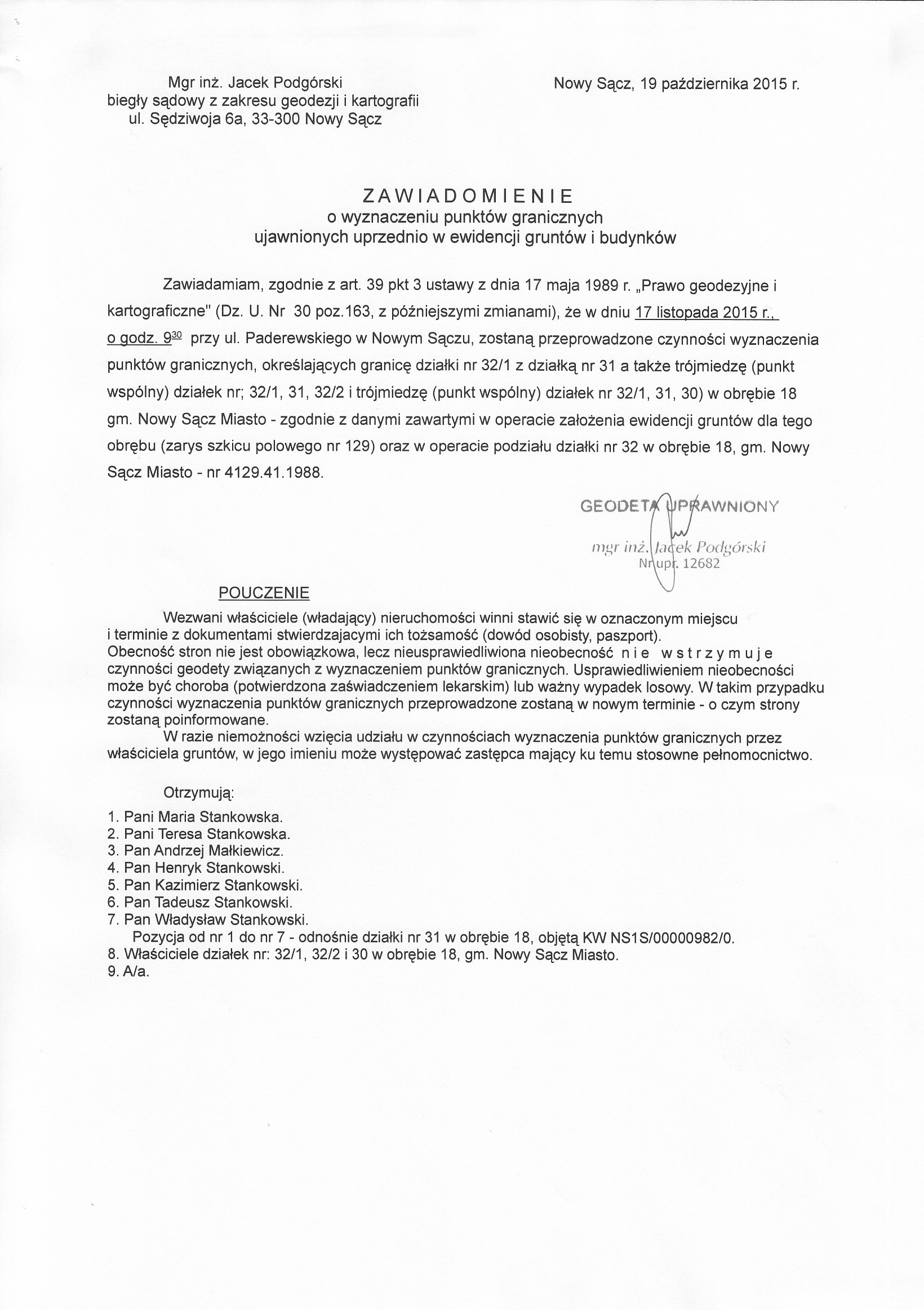Zawiadomienie o wyznaczeniu punktów granicznych ujawnionych uprzednio w ewidencji gruntów i budynków