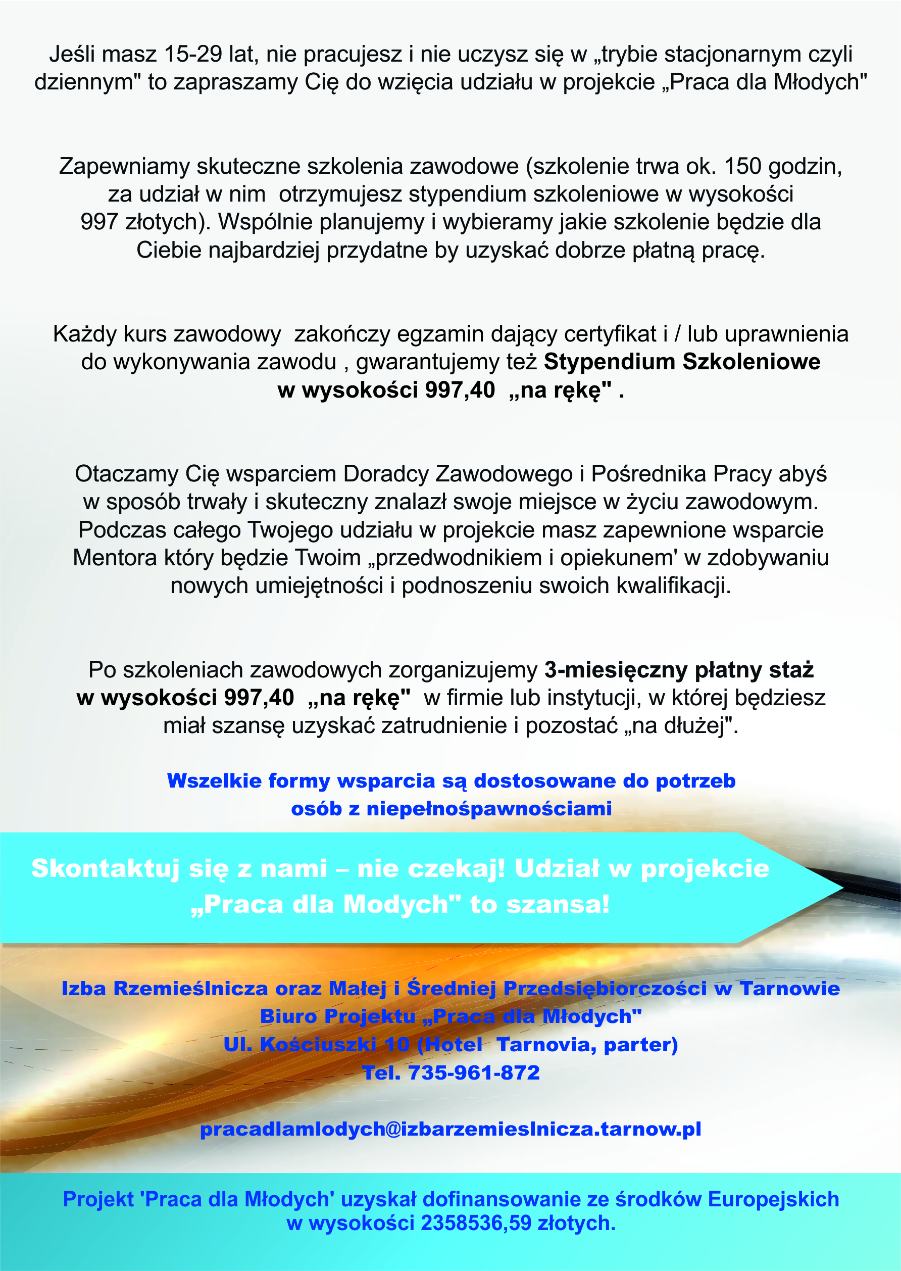Miło nam poinformować, że Izba Rzemieślnicza oraz Małej i Średniej Przedsiębiorczości w Tarnowie, rozpoczęła realizację projektu „Praca dla Młodych”. Naszym celem jest poprawa sytuacji ludzi młodych na rynku pracy ( 15-29 lat tzw. młodzież NEET), poprzez aktywizację społeczną i zawodową.