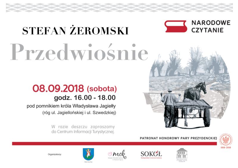 Urząd Miasta Nowego Sącza, Miejski Ośrodek Kultury, Małopolskie Centrum Kultury SOKÓŁ i Sądecka Biblioteka Publiczna zapraszają na Narodowe Czytanie „Przedwiośnia” Stefana Żeromskiego, które odbędzie się 8 września (sobota) w godz. 16.00 – 18.00 na ul. Jagiellońskiej, pod pomnikiem króla Władysława Jagiełły, obok Centrum Informacji Turystycznej.