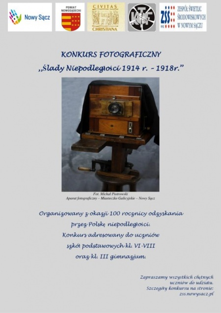 Katolickie Stowarzyszenie „Civitas Christiana” oddział w Nowym Sączu, Zespół Świetlic Środowiskowych w Nowym Sączu oraz Krynickie Towarzystwo Fotograficzne zapraszają do udziału w konkursie „Ślady Niepodległości. 1914 r. - 1918 r.”. Konkurs przeznaczony jest dla uczniów szkół podstawowych oraz gimnazjalnych z Nowego Sącza.