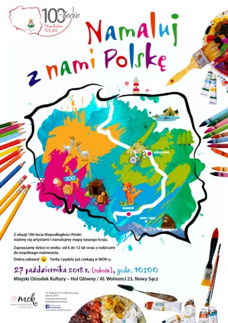 Miejski Ośrodek Kultury w Nowym Sączu zaprasza dzieci w wieku od 6 od 12 lat do wspólnego malowania mapy naszego kraju, z okazji stulecia odzyskania przez Polskę niepodległości. Początek imprezy w sobotę, 27 października, o godz. 10.00.