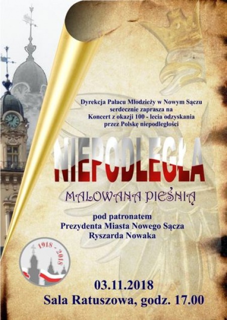 Pałac Młodzieży w Nowym Sączu jest organizatorem koncertu z okazji 100-lecia odzyskania przez Polskę niepodległości, który odbędzie się 3 listopada o godzinie 17:00 w sali im. Stanisława Małachowskiego nowosądeckiego ratusza. Patronat nad wydarzeniem objął Prezydent Miasta Nowego Sącza Ryszard Nowak.