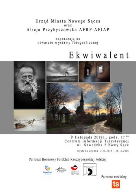 Wernisaż wystawy „Ekwiwalent”, której autorką jest Alicja Przybyszewska, odbędzie się 9 listopada o godzinie 17:00 w Centrum Informacji Turystycznej przy ulicy Szwedzkiej 2 w Nowym Sączu. Patronat nad wystawą sprawuje Urząd Miasta Nowego Sącza, Stowarzyszenie Dla Miasta, Fotoklub Rzeczypospolitej Polskiej Stowarzyszenie Twórców.