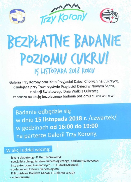 Koło Przyjaciół Dzieci Chorych na Cukrzycę działające przy Towarzystwie Przyjaciół Dzieci w Nowym Sączu, z okazji Światowego Dnia Walki z Cukrzycą, zaprasza mieszkańców miasta Nowego Sącza i okolic na akcję bezpłatnego badania poziomu cukru we krwi.
