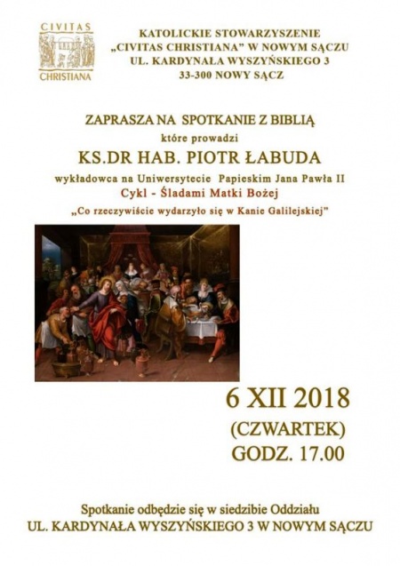 Katolickie Stowarzyszenie „Civitas Christiana” zaprasza na spotkanie z ks. dr hab. Piotrem Łabudą, wykładowcą na Uniwersytetu Papieskiego w Krakowie, zatytułowane „Co rzeczywiście wydarzyło się w Kanie Galilejskiej?”, które odbędzie się w czwartek, 6 grudnia, w siedzibie oddziału przy ul. Kardynała Wyszyńskiego 3 w Nowym Sączu.