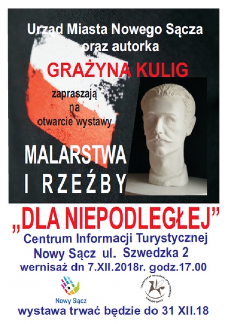 To jedna z najpopularniejszych i najbarwniejszych nowosądeckich postaci – Grażyna Kulig. Wernisaż wystawy jej malarstwa i rzeźby pod tytułem „Dla Niepodległej”, odbędzie się w piątek 7 grudnia o godzinie 17:00 w Centrum Informacji Turystycznej w Nowym Sączu przy ulicy Szwedzkiej 2.