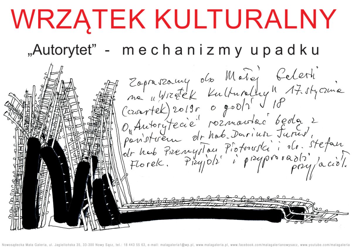 Nowosądecka Mała Galeria będzie miejscem kolejnej edycji „Wrzątku Kulturalnego", czyli publicznej wymiany poglądów na różne, ważne w życiu człowieka tematy. Tym razem spotkanie odbędzie się pod hasłem „Autorytet – mechanizmy upadku”. „Wrzątek” rozpocznie się 17 stycznia 2019 roku o godzinie 18:00.