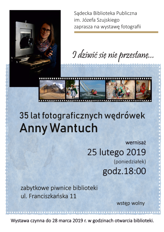 Sądecka Biblioteka Publiczna im. Józefa Szujskiego zaprasza na wernisaż wystawy "I dziwić się nie przestanę..." - 35 lat fotograficznych wędrówek Anny Wantuch. Wernisaż odbędzie się 25 lutego (poniedziałek), o godz. 18.00 w zabytkowych piwnicach biblioteki przy ul. Franciszkańskiej 11. Wystawę będzie można oglądać do 28 marca w godzinach otwarcia placówki.