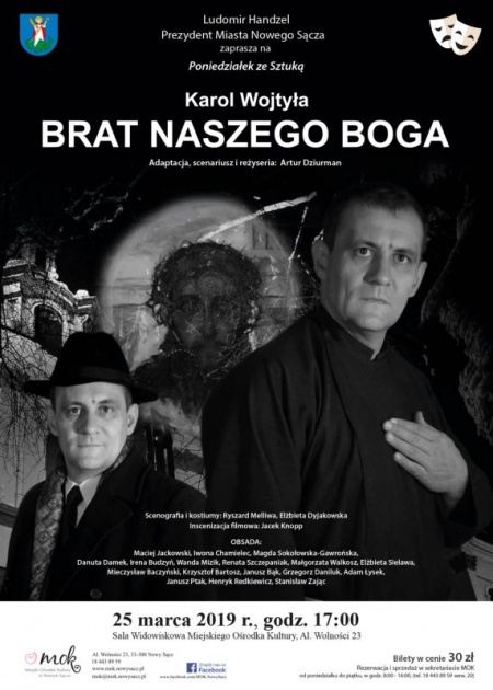 Prezydent Miasta Nowego Sącza Ludomir Handzel zaprasza na kolejne wydarzenie w ramach Poniedziałków ze Sztuką. 25 marca sądeczanie będą mogli obejrzeć sztukę Karola Wojtyły pt. „Brat naszego Boga”. Spektakl odbędzie się o godz. 17.00 w Sali Widowiskowej MOK przy Al. Wolności 23.
