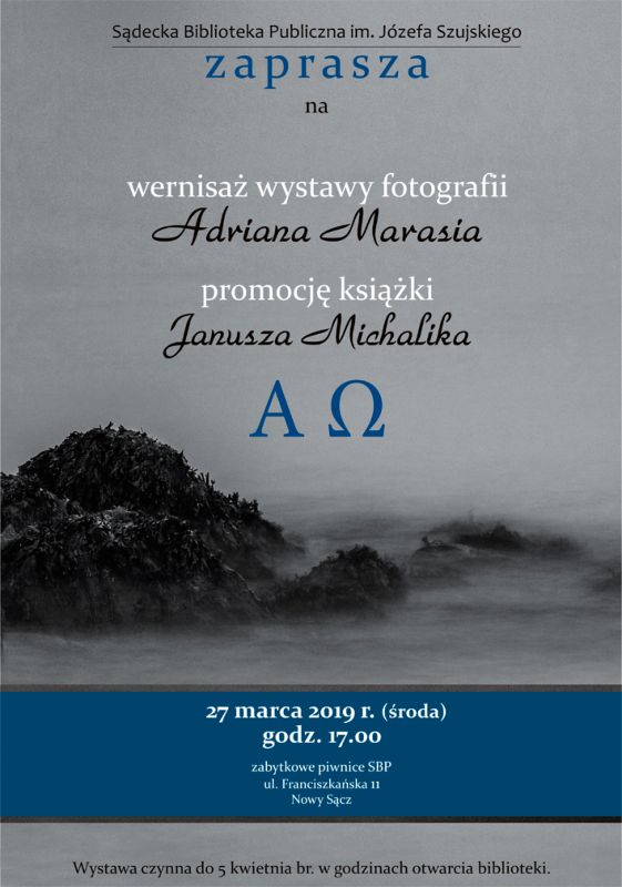 Sądecka Biblioteka Publiczna im. Józefa Szujskiego zaprasza na wernisaż wystawy fotografii Adriana Marasia oraz promocję książki Janusza Michalika „A Ω”. Spotkanie odbędzie się 27 marca 2019 o godz. 17:00 w zabytkowych piwnicach SBP przy ul. Franciszkańskiej 11. Wystawę fotografii Adriana Marasia będzie można oglądać do 5 kwietnia.