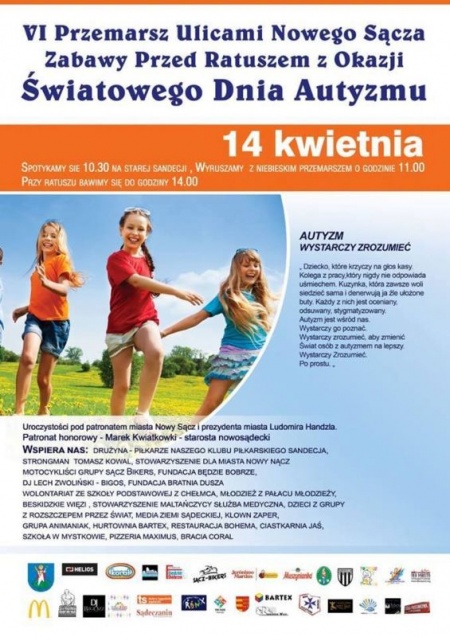 Pod patronatem Prezydenta Miasta Nowego Sącza Ludomira Handzla odbędzie się 14 kwietnia VI Przemarsz Ulicami Miasta Nowego Sącza z okazji Światowego Dnia Autyzmu. Uczestnicy marszu pod hasłem "Autyzm wystarczy zrozumieć", przejdą na płytę Rynku, gdzie zaplanowano dla wszystkich sporo atrakcji.