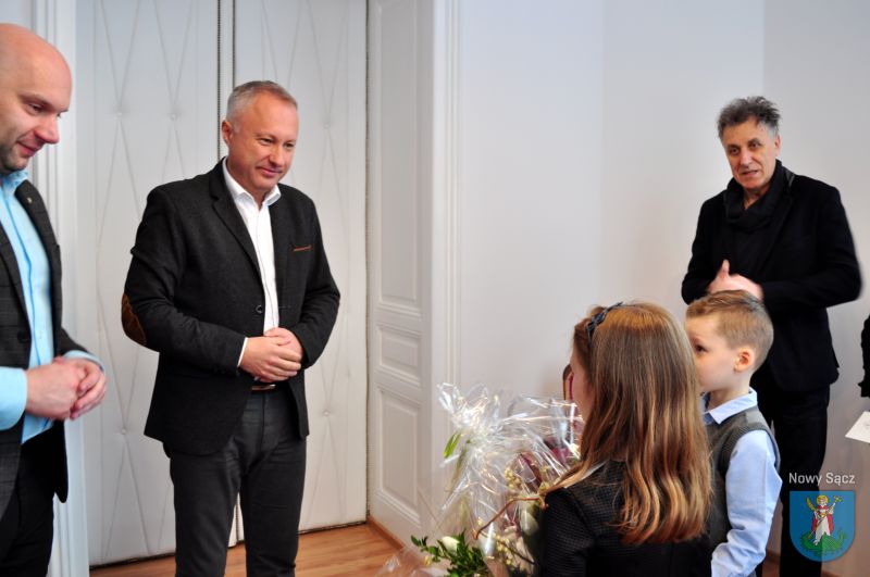 Pięknych życzeń od sądeckich uczniów, w tym rymowanych, które zaprezentowały dzieci z Pałacu Młodzieży, wysłuchał Prezydent Miasta Nowego Sącza Ludomir Handzel oraz jego zastępcy: wiceprezydent Artur Bochenek oraz wiceprezydent Magdalena Majka. Dzieci za każdym razem wręczyły prezydentom piękne świąteczne stroiki.