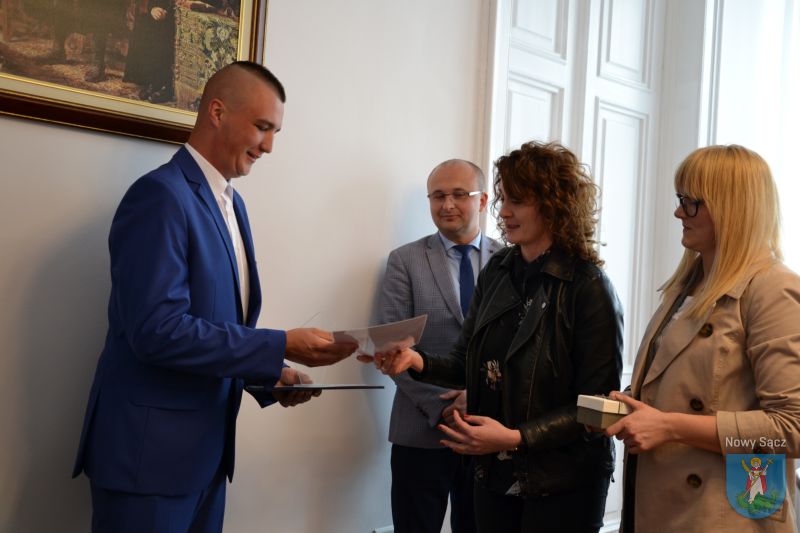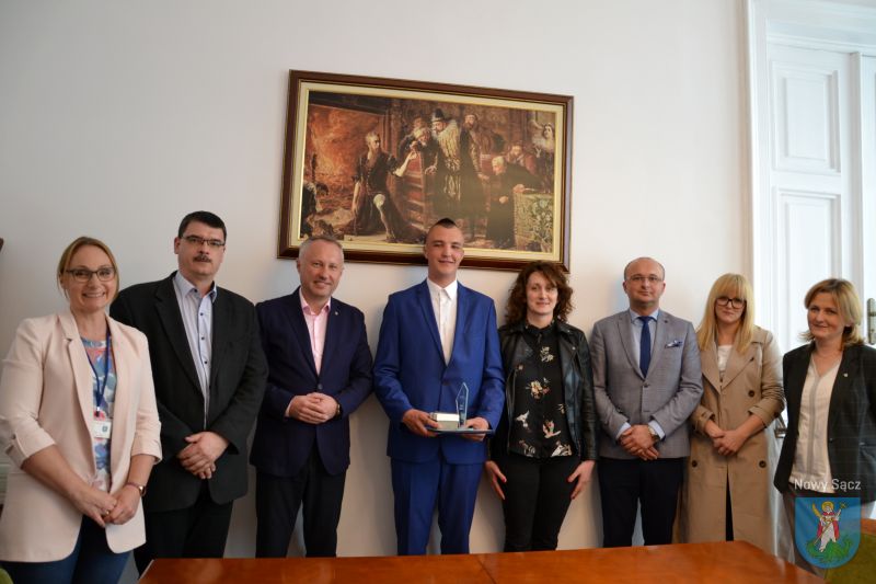 Michał Dziadosz – uczeń ostatniej klasy technikum w Zespole Szkół Samochodowych, odebrał z rąk Prezydenta Miasta Nowego Sącza Ludomira Handzla list gratulacyjny oraz podziękowanie za zaangażowanie w prace na rzecz drugiego człowieka. Michał jest wolontariuszem, biorącym udział w wielu akcjach charytatywnych.