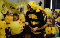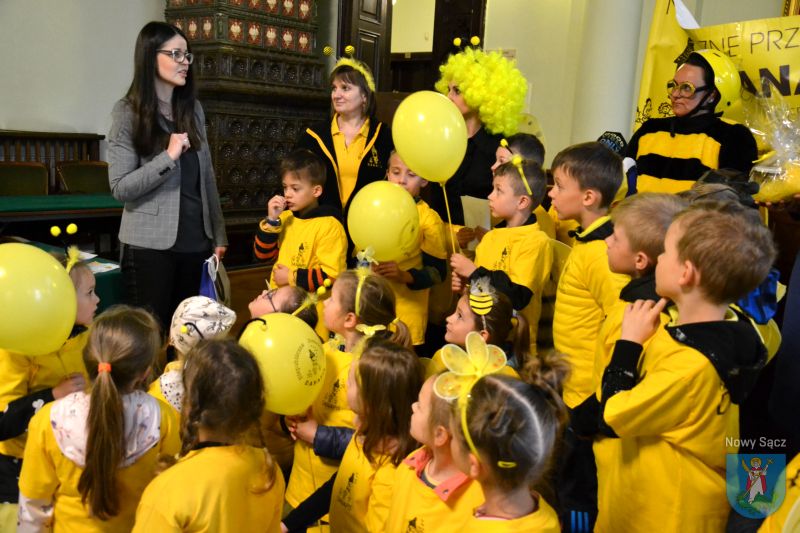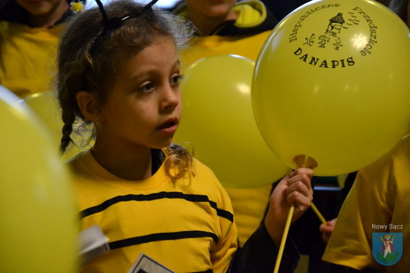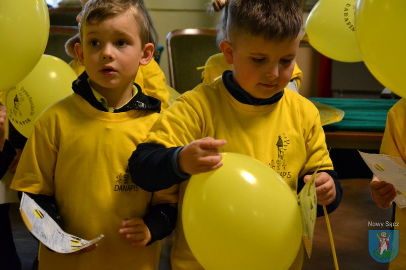 Spacerując po Nowym Sączu, przedszkolaki rozdawały przechodniom żółte balony oraz przygotowane przez siebie rysunki z hasłami, dotyczącymi tych pożytecznych dla ludzi owadów.