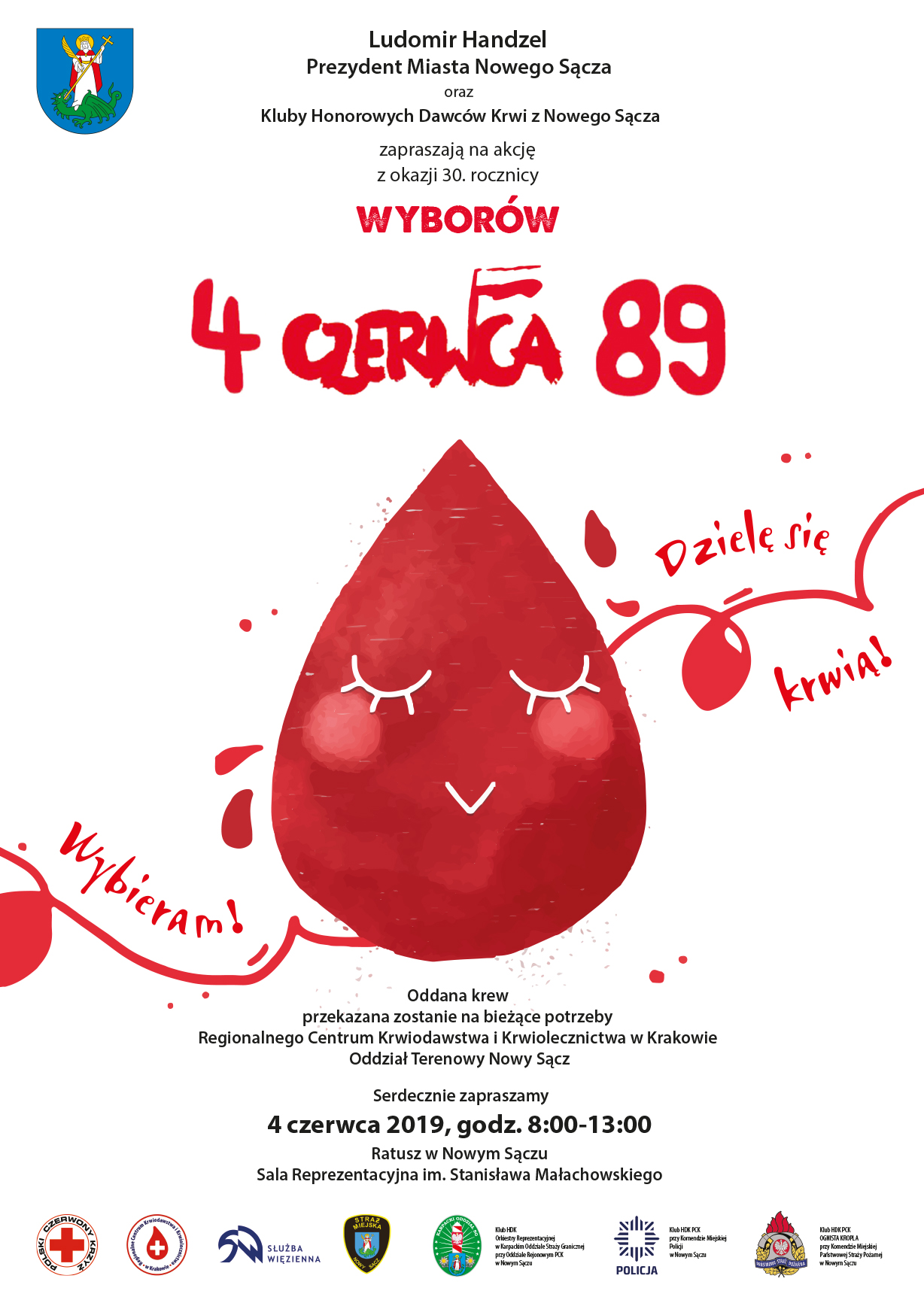 Prezydent Miasta Nowego Sącza Ludomir Handzel oraz Klub Honorowych Dawców Krwi zapraszają do uczczenia w sposób szczególny 30. rocznicy wyborów 4 czerwca ‘89. W tym dniu w sali reprezentacyjnej Ratusza będzie można oddać krew, która zasili bank Regionalnego Centrum Krwiodawstwa i Krwiolecznictwa w Krakowie Oddział Terenowy w Nowym Sącz. Oddawanie krwi będzie możliwe w godzinach od 8:00 do 13:00.