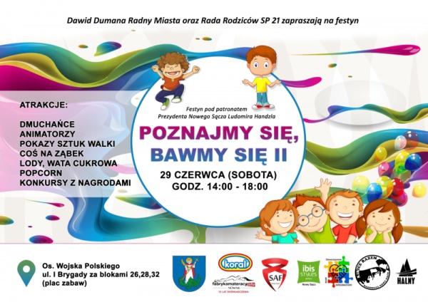 Dawid Dumana Radny Miasta Nowego Sącza oraz Rada Rodziców Szkoły Podstawowej nr 21 w Nowym Sączu zapraszają na festyn ‘’Poznajmy się, bawmy się II”. Impreza odbędzie się już jutro 29 czerwca (sobota) na osiedlu Wojska Polskiego. Wydarzeniu patronuje Prezydent Miasta Nowego Sącza Ludomir Handzel.