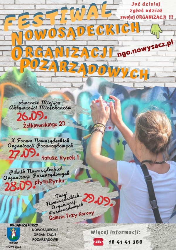 Formularz zgłoszenia udziału oraz szczegółowe informacje znajdują się na stronie: https://www.nowysacz.pl/informacje-dla-ngo/21739. Zgłoszenia przyjmowane będą do 5 września br. Pytania związane z Festiwalem prosimy kierować do Referatu Aktywności Obywatelskiej Urzędu Miasta Nowego Sącza: tel. 18 41 41 388 lub e-mail: mfurmanek@nowysacz.pl