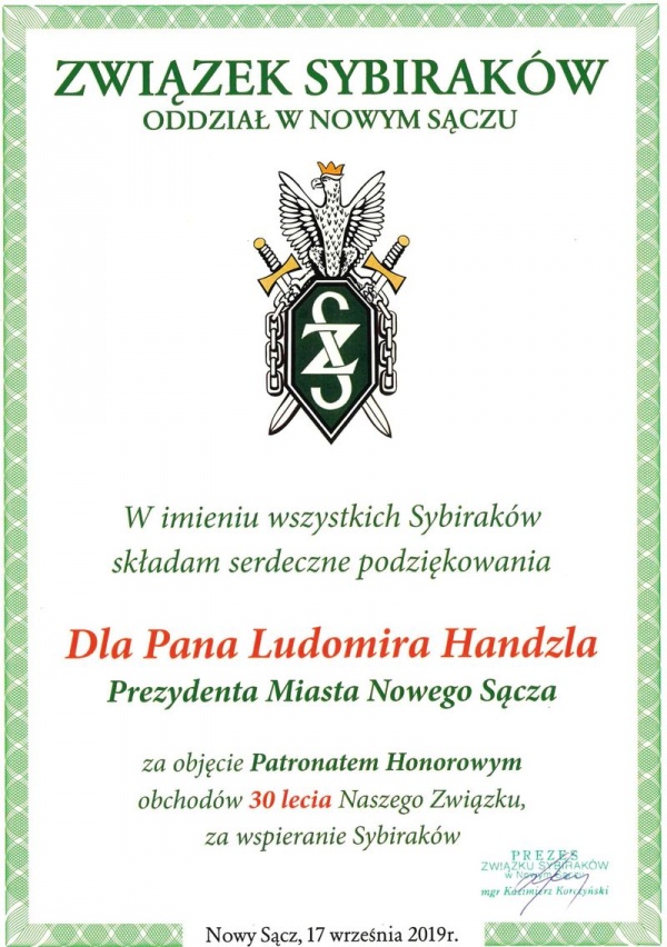 Związek Sybiraków obchodził 30-lecie działalności (17 września). Kilkudziesięciu członków Związku Sybiraków na Sądecczyźnie i Ziemi Gorlickiej spotkało się, aby złożyć kwiaty pod obeliskiem poświęconym zamęczonym i pomordowanym na nieludzkiej ziemi. Członkowie Związku i osoby dla niego zasłużone otrzymały odznaczenia i podziękowania. Wśród nich był prezydent Nowego Sącza Ludomir Handzel, który objął uroczystości patronatem honorowym.