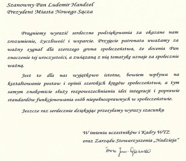 Prezydent wręczył prezes Stowarzyszenia "Nadzieja" Teresie Jaros – Ligaszewskiej wiązankę kwiatów i list gratulacyjny. Gospodarze odwdzięczyli się podobnym adresem do prezydenta Ludomira Handzla, w którym napisali między innymi: - Pragniemy wyrazić serdeczne podziękowania za okazane nam zrozumienie, życzliwość i wsparcie. Przyjęcie patronatu uważamy za ważny sygnał dla szerszego grona społeczeństwa, że docenia Pan znaczenie tej uroczystości, a związaną z nią tematykę uznaje za społecznie ważną – napisała prezes "Nadziei".