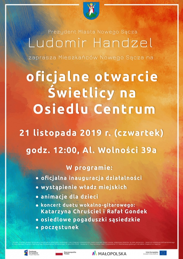 Prezydent Ludomir Handzel zaprasza na oficjalne otwarcie świetlicy na Osiedlu Centrum. Placówka mieści się przy Al. Wolności 39a. Oficjalna inauguracja działalności będzie miała miejsce 21 listopada 2019 r. (czwartek) o godzinie 12:00.