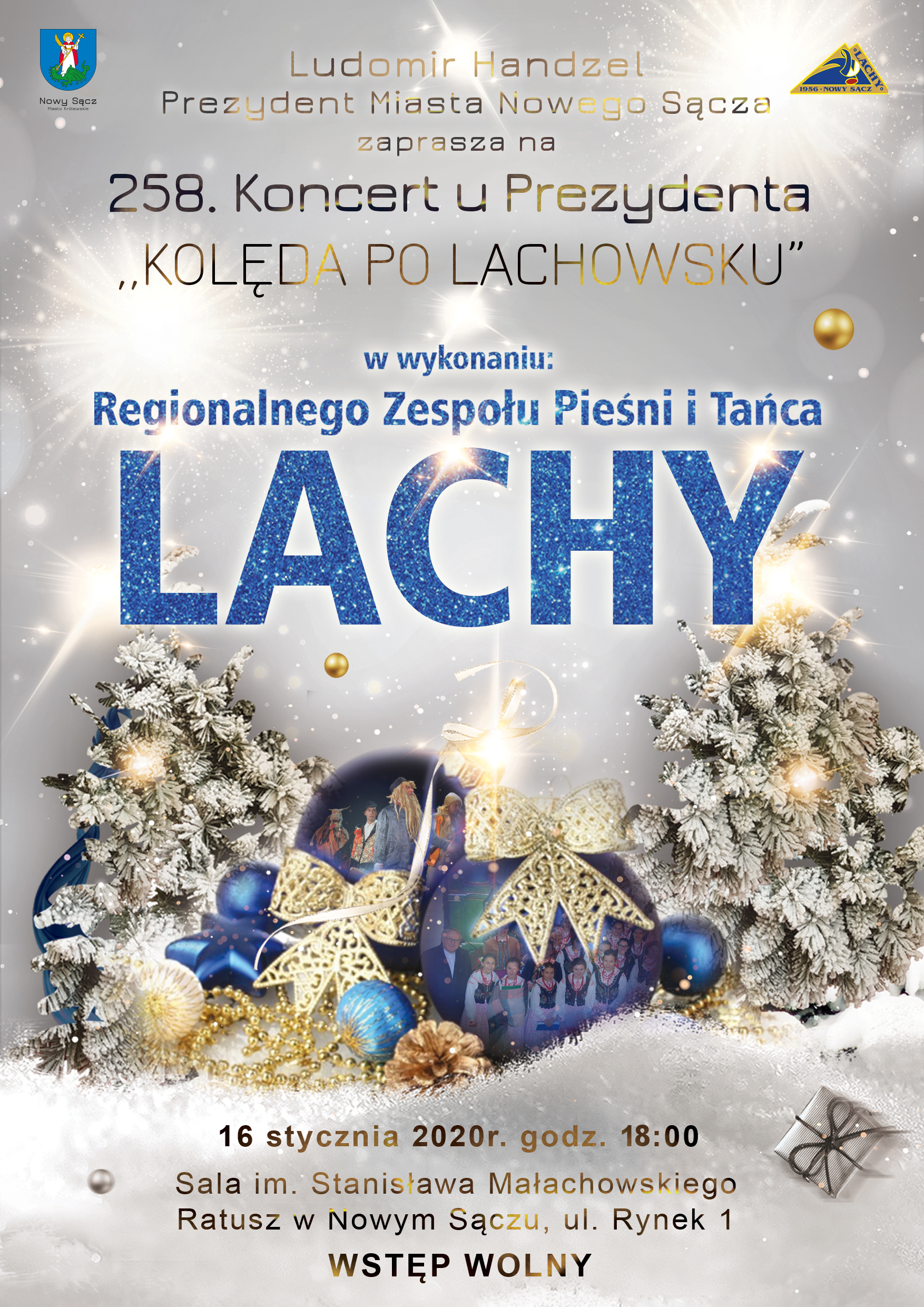 Prezydent Ludomir Handzel zaprasza na 258. Koncert u Prezydenta „Kolęda po Lachowsku” w wykonaniu Regionalnego Zespołu Pieśni i Tańca „Lachy”. Wydarzenie odbędzie się 16 stycznia 2020 r. o godz. 18:00 w sali im. Stanisława Małachowskiego w sądeckim Ratuszu. Wstęp na wydarzenie jest wolny.